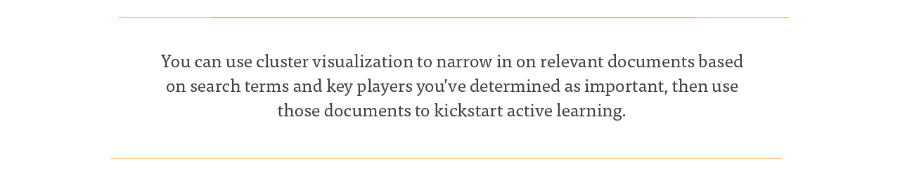 For example, you can use cluster visualization to narrow in on relevant documents based on search terms and key players you’ve determined as important, then use those documents to kickstart active learning. Right off the bat, the active learning engine will have a solid understanding of what’s relevant—based on your coding of relevant documents—and deliver more of those types of documents to your team.