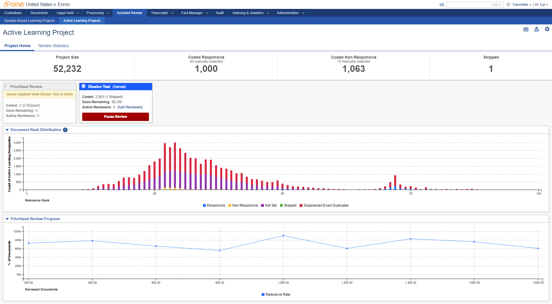 Your review is winding down, but when is it safe to call it? Elusion testing can help with that. It’s a new validation test you run at the end of the project to see which relevant documents were missed. To help you determine when it’s time to run the elusion test, take a peek at the review progress report, which records the percentage of documents coded responsive from the queue. As your review progresses, you’ll see fewer responsive documents for RelativityOne to serve up. Once you stop seeing a high portion of responsive documents on the graph, it’s time to run the elusion test.