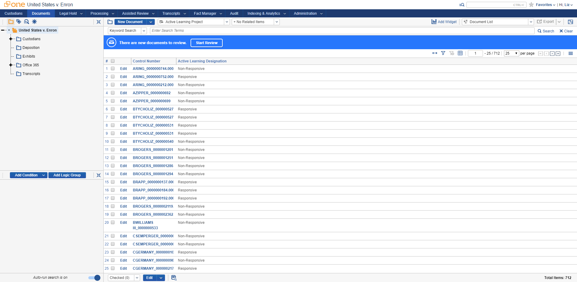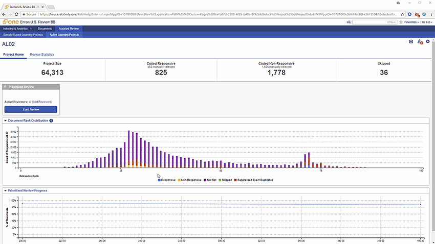 Getting to the most important documents doesn’t have to take a lot of effort. Active learning handles the brunt of the work, with minimal setup and human input. You can take a 100,000-document project from setup to review in under 10 minutes. There’s no need for training sets, no manually batching documents. Reviewers simply log in, click a button, and start reviewing the most relevant data. And because the review queue of documents is continuous, administrators don’t have to worry about any next steps, and they can easily monitor the results.