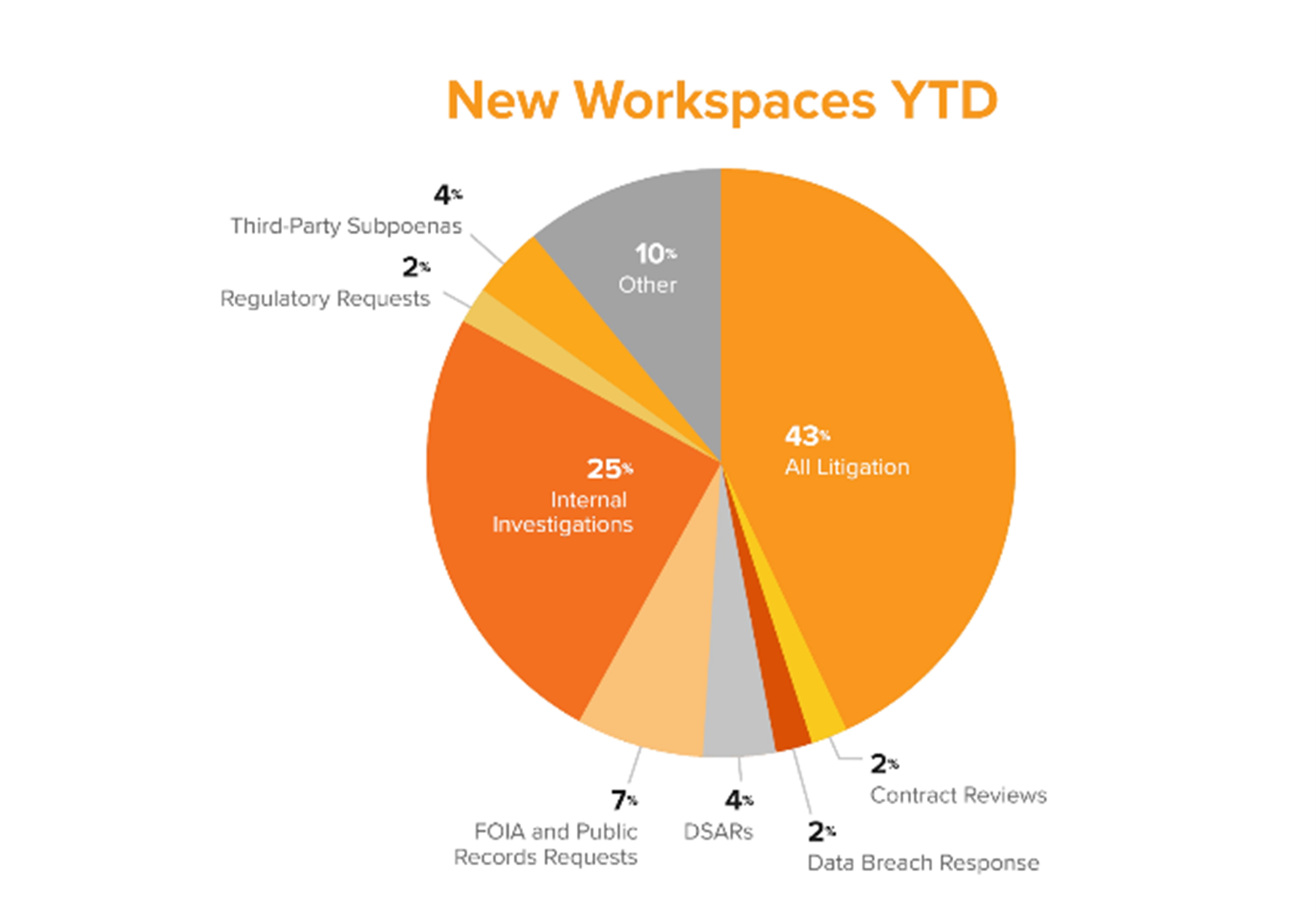 In 2025, 43 percent of new workspaces in RelativityOne are dedicated to litigation matters, reinforcing the core use case for our community. But the breadth of projects you conduct in the platform has transformed to also include investigations, FOIA requests, data breach responses, third-party subpoenas, and more.