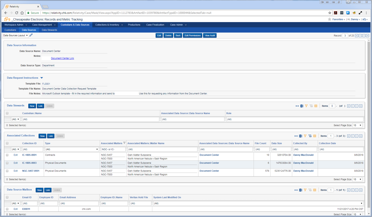 Chesapeake Energy needed the ability to have a top-level view of all legal cases and their data. They created an application, Chesapeake Energy Records and Metrics Tracking (CERMT), to transform Relativity into a complete case management system that provides the legal teams with powerful and intuitive tools to track all elements of a legal case. CERMT tracks matters, custodians, collections, productions, data locations, and case closure information, with tasking and email notifications.