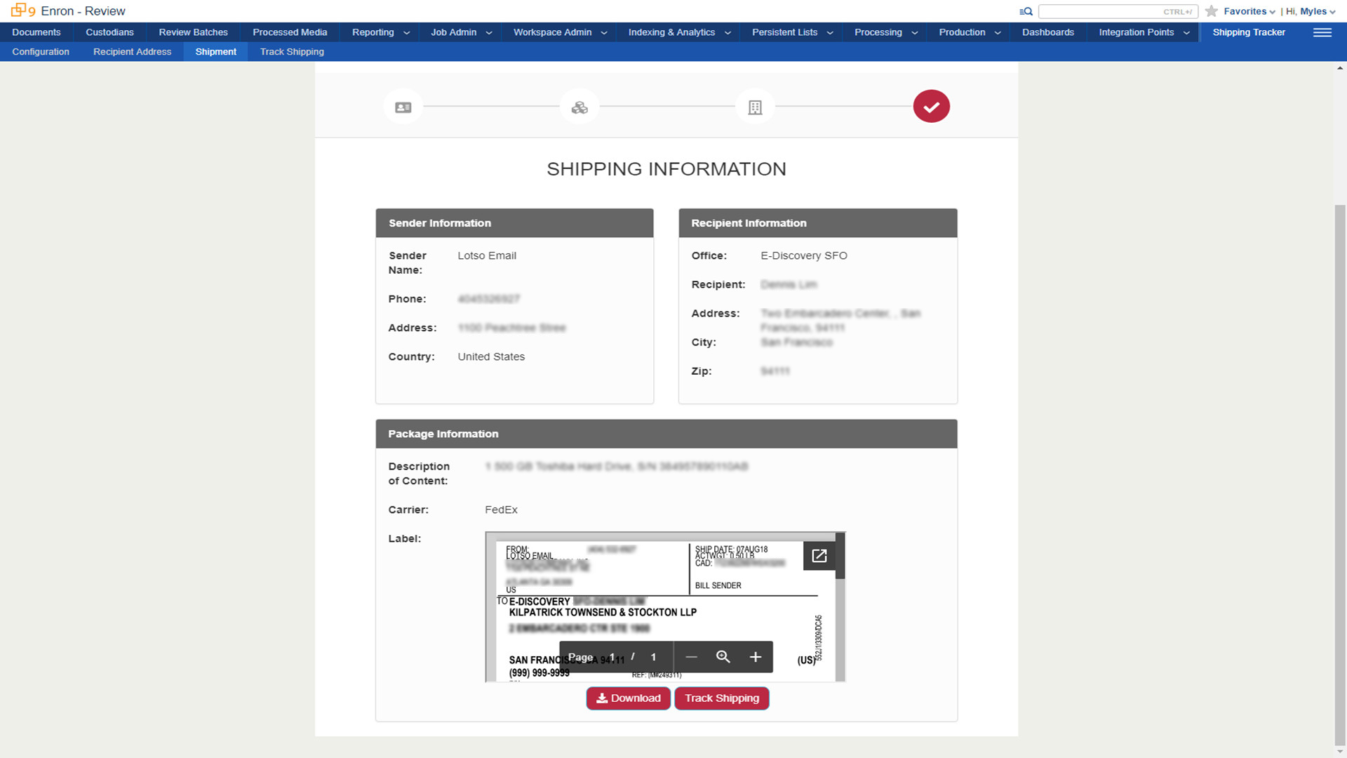 Kilpatrick Townsend identified a need for a tightly integrated shipping solution to ensure they’re able to track shipped media that contains sensitive information. They developed LitSmart® Shipping Tracker for clients to deliver data to their team, track its location, and manage shipping costs, all within one application. The solution enables clients to create shipping labels and track the shipment’s progress within Relativity, drastically simplifying a multi-step process, saving time and headaches.