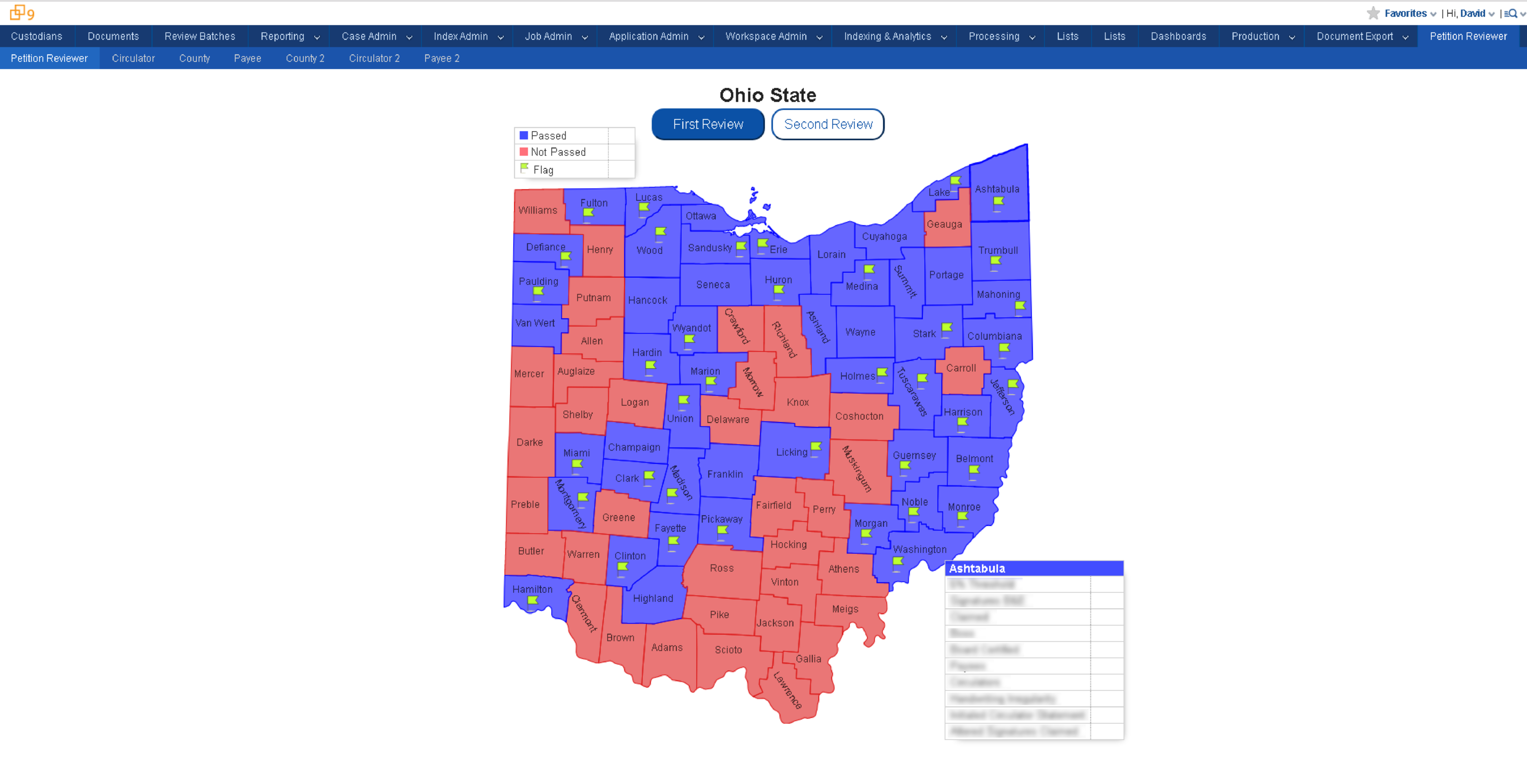 The application identifies errors in signature collection by scanning the petitions against other data sources, including ID and address records and Google Maps data. Attorneys could then investigate trends and irregularities to challenge suspicious signatures and build their case using accurate statistics. Throughout the matter, attorneys could track the current projections for valid versus invalid signatures on an ‘election-style’ county map of Ohio, also fully built into Relativity.