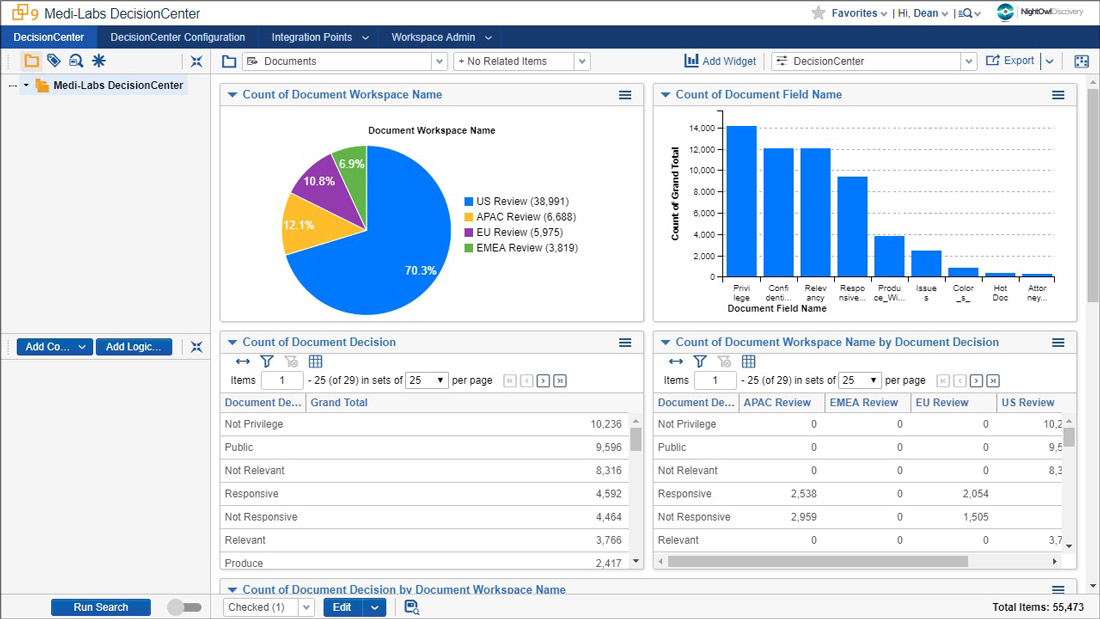 NightOwl designed a suite of tools allowing case managers and reviewers to leverage common information across multiple matters. When there is a significant overlap of documents across reviews, DecisionCenter offers the ability to reuse decisions across workspaces via a series of custom agents, saved searches, and Relativity Integration Points jobs, accelerating review by pointing teams to the relevant documents as early as possible.