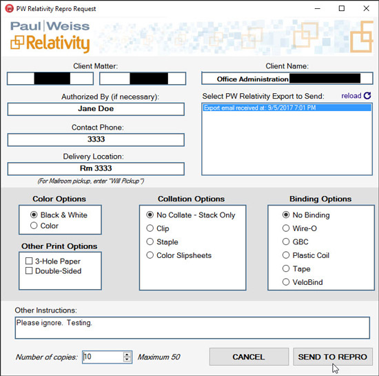 Paul, Weiss, Rifkind needed a streamlined, standardized way to print and bind discovery materials—otherwise only available electronically—for lawyers to bring to trials and depositions. They created PW Power Print Plus, which uses the Save as PDF mass action to eliminate the need for print teams to access Relativity. The PDFs are sent to a secure share where lawyers can connect to their self-service interface and send a print request with custom binding instructions.
