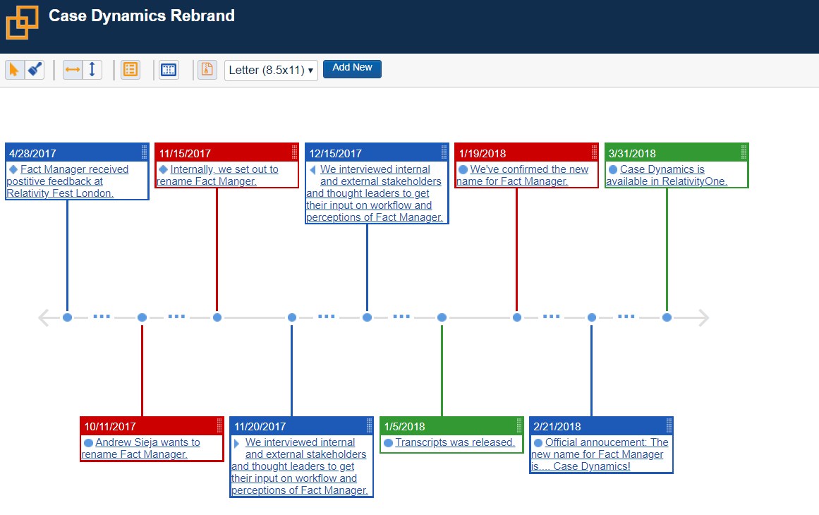 - Craft your strategy: present a chronological progression of the facts with a customizable and interactive timeline that builds itself as you build your case.