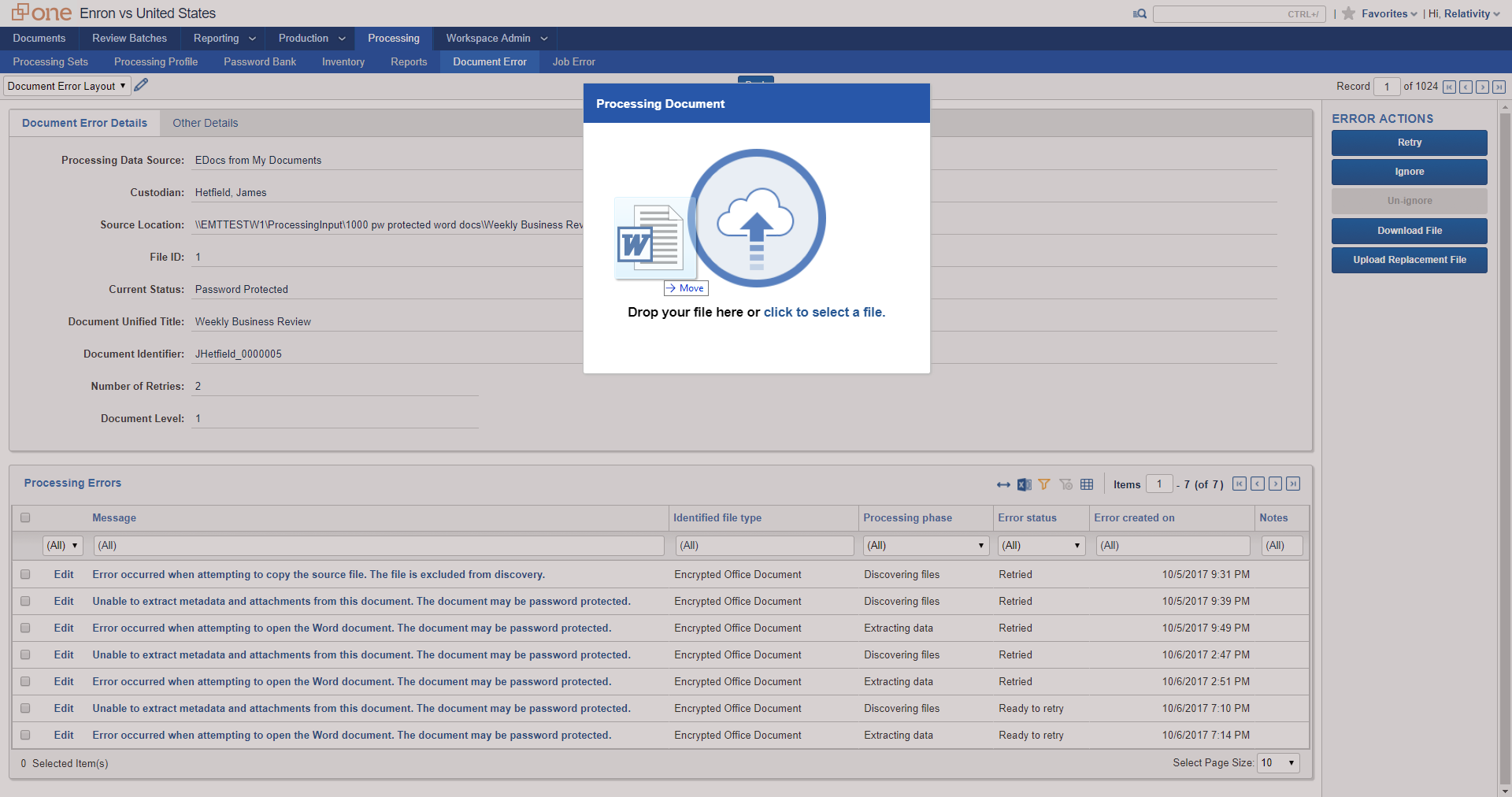 A new document-level error workflow in Relativity Processing makes it easier to investigate and address errors. You can use mass action functionality to resolve multiple errors on multiple documents at the same time. The new workflow also offers additional ways to easily address errors on a single document, such as the ability to download the file, fix the errors, drag and drop the file back into the workspace, and move on to the next document.