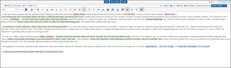 Then, simply highlight text and right-click to create facts, issues, key players, and interview questions. You can also link hot documents as the case begins to progress.