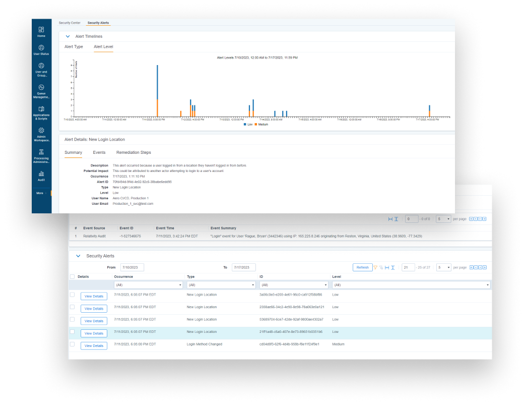 RelativityOne customers use Security Center – a powerful monitoring application developed by Calder7 – to gain actionable insights and take control over the security of their data.