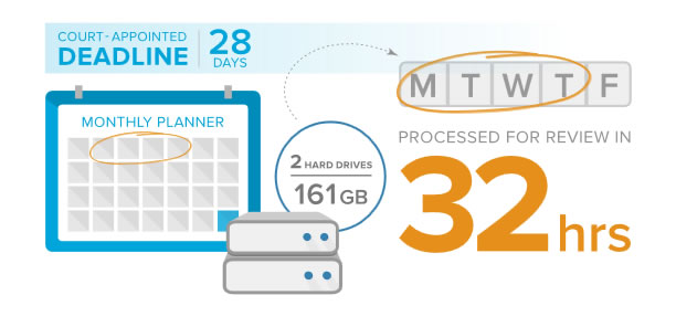 During litigation, Dickinson Wright received a court order to pull out the former employee’s documents from two hard drives—which ultimately totaled 232,350 records—review them, and produce the responsive documents to the court in 28 days.
